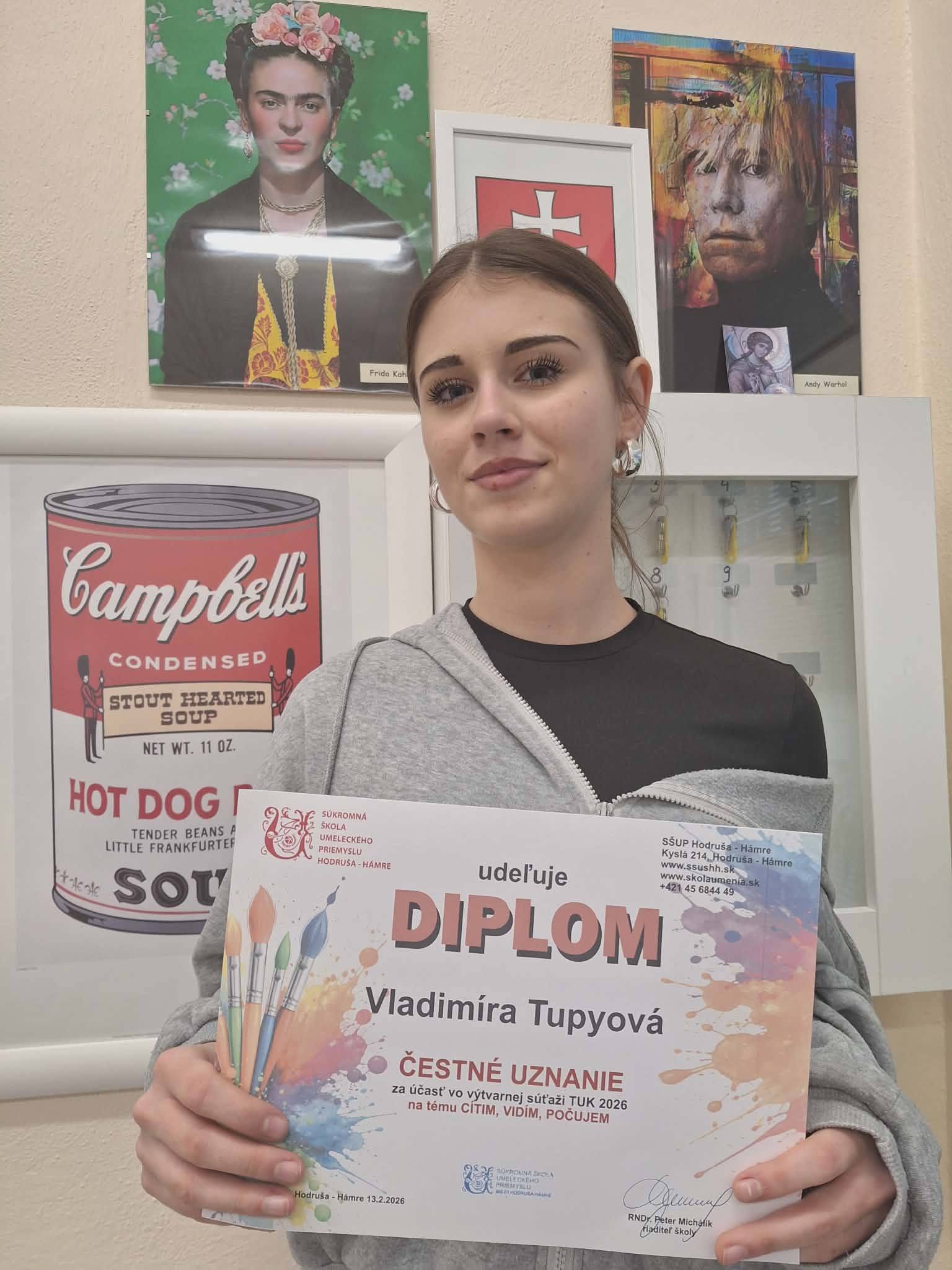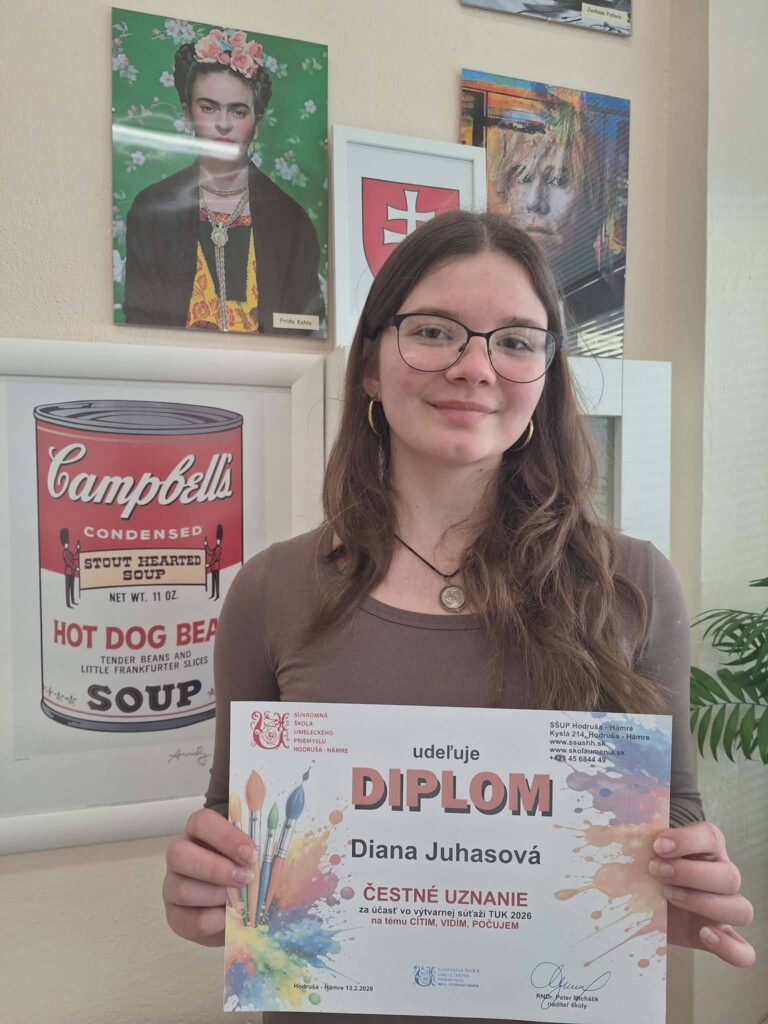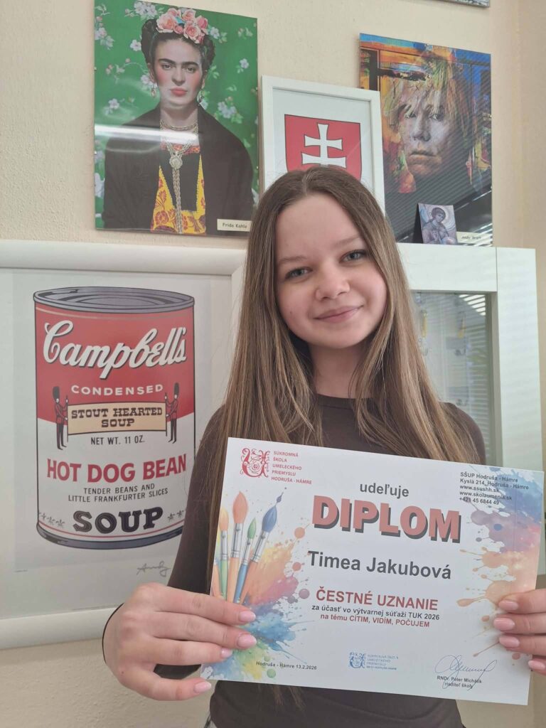 Naši starší žiaci výtvarného odboru pod vedením uč. Mgr. Henriety Referovičovej sa zúčastnili celoslovenskej výtvarnej súťaže „Talent-umenie-kumšt“, ktorú organizovala škola umeleckého priemyslu Hodruša – Hámre. Ich práce postúpili do 2. kola medzi 10 najlepších vo svojej kategórii, čo je veľký úspech. Za svoju snahu získali čestné uznanie tieto žiačky: