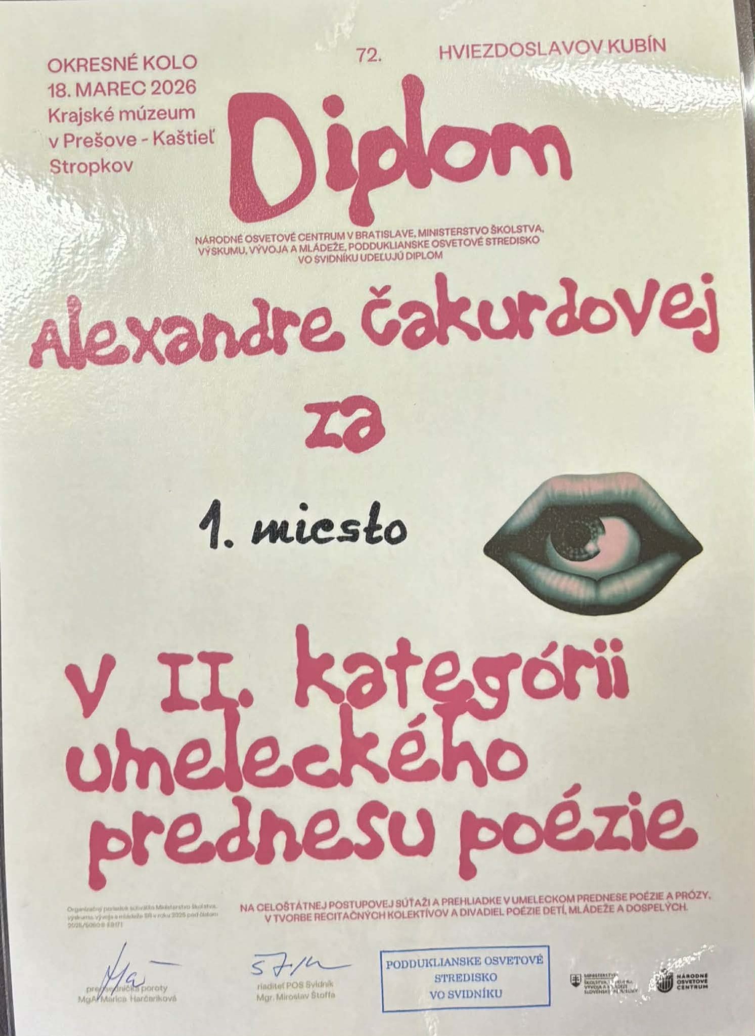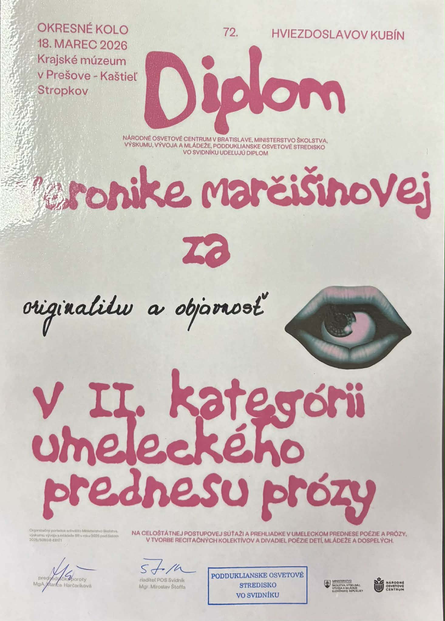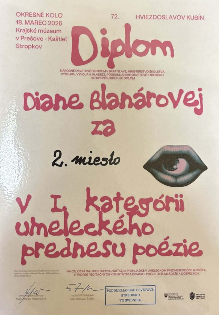 Okresné kolo recitačnej súťaže Hviezdoslavov Kubín, ktoré sa konalo 18.3.2026 v kaštieli Stropkov, nám prinieslo úspech a porota udelila tieto krásne ocenenia :